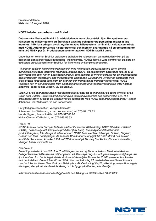”BrainLit är ett spännande bolag vars lösning strävar efter att ge människor ett bättre liv vilket är en vision som vi delar. BrainLits produkter är även tekniskt avancerade och passar väl in i NOTEs erbjudande och vi är glada att BrainLit valt att samarbeta med NOTE som produktionspartner ”, säger Johannes Lind-Widestam, vd och koncernchef.