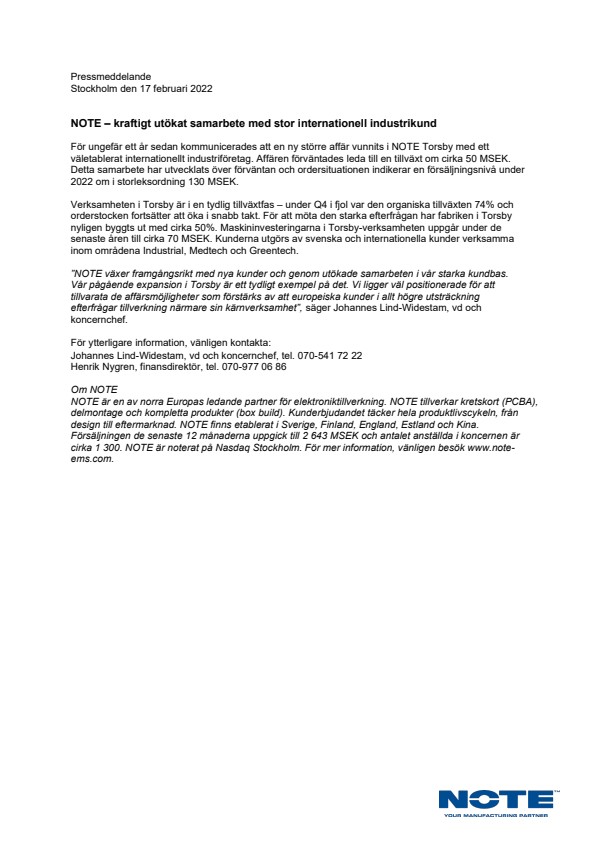 För ungefär ett år sedan kommunicerades att en ny större affär vunnits i NOTE Torsby med ett väletablerat internationellt industriföretag. Affären förväntades leda till en tillväxt om cirka 50 MSEK. Detta samarbete har utvecklats över förväntan och ordersituationen indikerar en försäljningsnivå under 2022 om i storleksordning 130 MSEK.