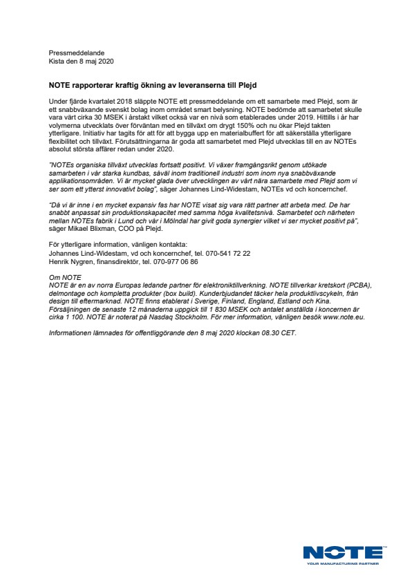 Under fjärde kvartalet 2018 släppte NOTE ett pressmeddelande om ett samarbete med Plejd, som är ett snabbväxande svenskt bolag inom området smart belysning. NOTE bedömde att samarbetet skulle vara värt cirka 30 MSEK i årstakt vilket också var en nivå som etablerades under 2019. Hittills i år har volymerna utvecklats över förväntan med en tillväxt om drygt 150% och nu ökar Plejd takten ytterligare. Initiativ har tagits för att för att bygga upp en materialbuffert för att säkerställa ytterligare flexibilitet och tillväxt. Förutsättningarna är goda att samarbetet med Plejd utvecklas till en av NOTEs absolut största affärer redan under 2020.