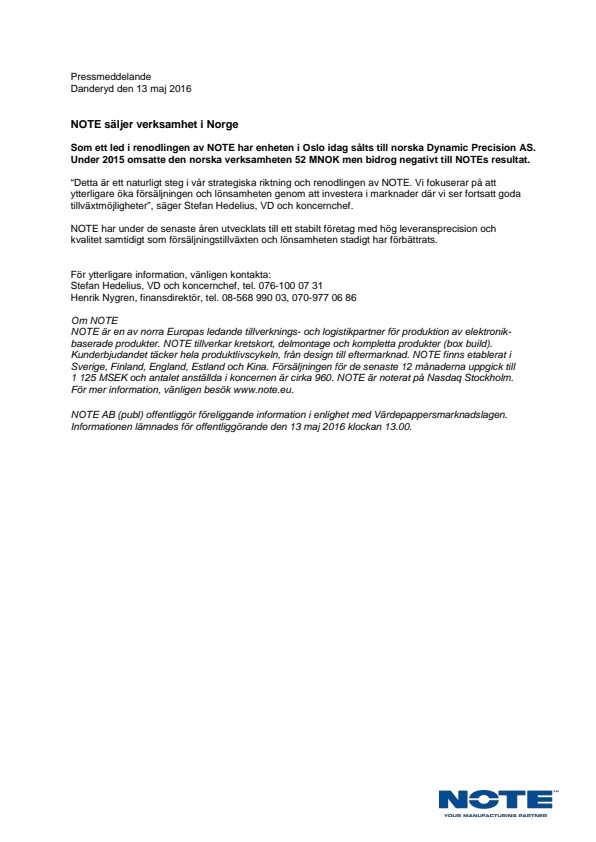 NOTE är en av norra Europas ledande tillverknings- och logistikpartner för produktion av elektronikbaserade produkter. NOTE tillverkar kretskort, delmontage och kompletta produkter (box build). Kunderbjudandet täcker hela produktlivscykeln, från design till eftermarknad. NOTE finns etablerat i Sverige, Finland, England, Estland och Kina. Försäljningen för de senaste 12 månaderna uppgick till 1 125 MSEK och antalet anställda i koncernen är cirka 960. NOTE är noterat på Nasdaq Stockholm. För mer information, vänligen besök www.note.eu.