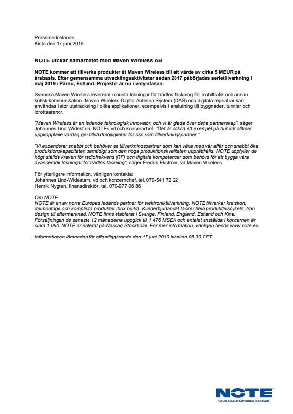 ”Maven Wireless är en ledande teknologisk innovatör, och vi är glada över detta partnerskap”, säger Johannes Lind-Widestam, NOTEs vd och koncernchef. ”Det är också ett exempel på hur vår alltmer uppkopplade vardag ger tillväxtmöjligheter för oss som tillverkningspartner.”