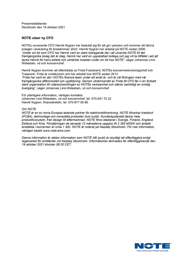 NOTEs nuvarande CFO Henrik Nygren har beslutat sig för att gå i pension och kommer att lämna bolaget i anslutning till årsstämman 2022. Henrik Nygren har arbetat på NOTE sedan 2006.