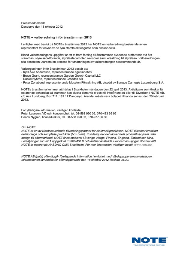 NOTE – valberedning inför årsstämman 2013