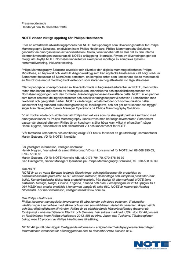 Efter en omfattande utvärderingsprocess har NOTE fått uppdraget som tillverkningspartner för Philips Mammography Solutions, en division inom Philips Healthcare. Philips Mammography Solutions genomför en omorganisation av verksamheten i Solna, vilket innebär att en stor del av den interna elektronikmonteringen outsourcas till NOTEs anläggning i Norrtälje. Flytten av tillverkningen gör det möjligt att utnyttja NOTE Norrteljes kapacitet för exempelvis montage av komplexa system i renrumstillverkning, inklusive testning.