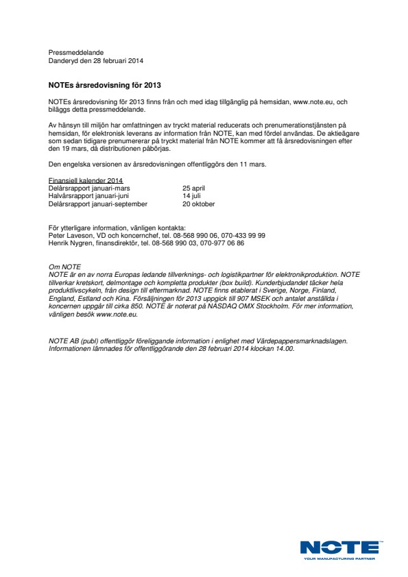 NOTE är en av norra Europas ledande tillverknings- och logistikpartner för elektronikproduktion. NOTE tillverkar kretskort, delmontage och kompletta produkter (box build). Kunderbjudandet täcker hela produktlivscykeln, från design till eftermarknad. NOTE finns etablerat i Sverige, Norge, Finland, England, Estland och Kina. Försäljningen för 2013 uppgick till 907 MSEK och antalet anställda i koncernen uppgår till cirka 850. NOTE är noterat på NASDAQ OMX Stockholm. För mer information, vänligen besök www.note.eu.