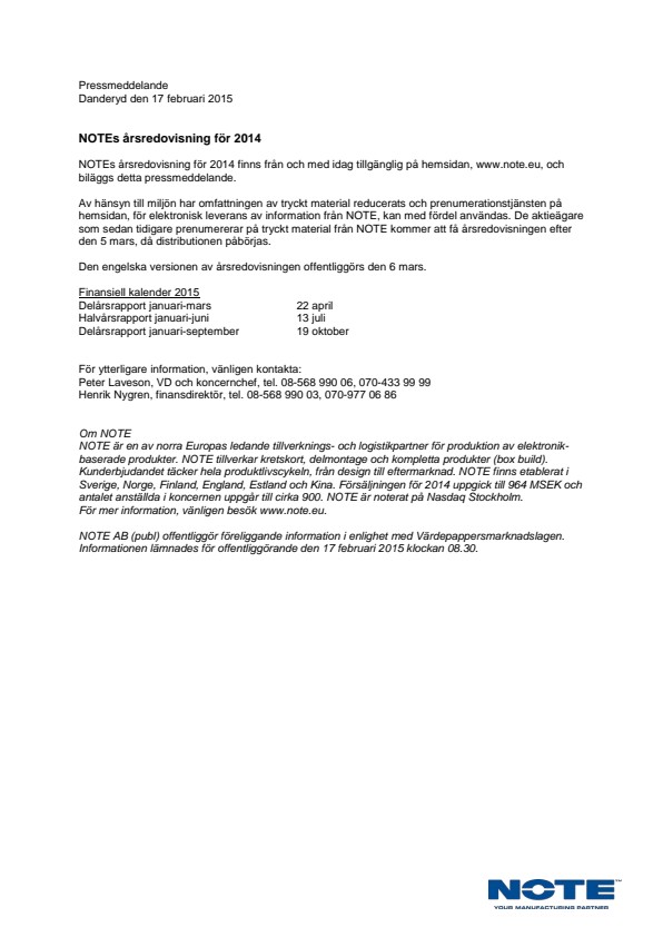 NOTEs årsredovisning för 2014 finns från och med idag tillgänglig på hemsidan, www.note.eu, och biläggs detta pressmeddelande.