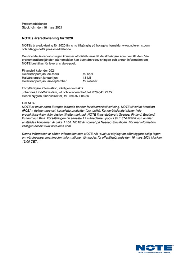 NOTEs årsredovisning för 2020 finns nu tillgänglig på bolagets hemsida, www.note-ems.com, och biläggs detta pressmeddelande.