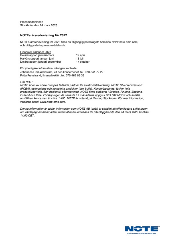 NOTEs årsredovisning för 2022 finns nu tillgänglig på bolagets hemsida, www.note-ems.com, och biläggs detta pressmeddelande.