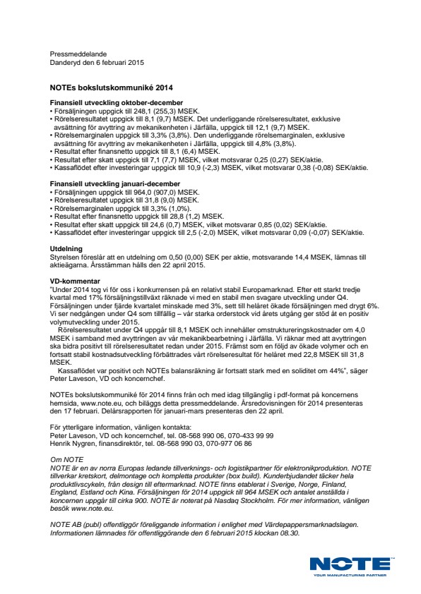 NOTEs bokslutskommuniké för 2014 finns från och med idag tillgänglig i pdf-format på koncernens hemsida, www.note.eu, och biläggs detta pressmeddelande. Årsredovisningen för 2014 presenteras den 17 februari. Delårsrapporten för januari-mars presenteras den 22 april.
