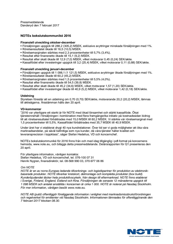 NOTEs bokslutskommuniké för 2016 finns från och med idag tillgänglig i pdf-format på koncernens hemsida, www.note.eu, och biläggs detta pressmeddelande. Delårsrapporten för Q1 presenteras den 20 april.