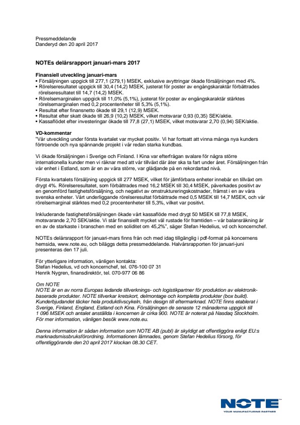 Denna information är sådan information som NOTE AB (publ) är skyldigt att offentliggöra enligt EU:s marknadsmissbruksförordning. Informationen lämnades, genom Stefan Hedelius försorg, för offentliggörande den 20 april 2017 klockan 08.30 CET.