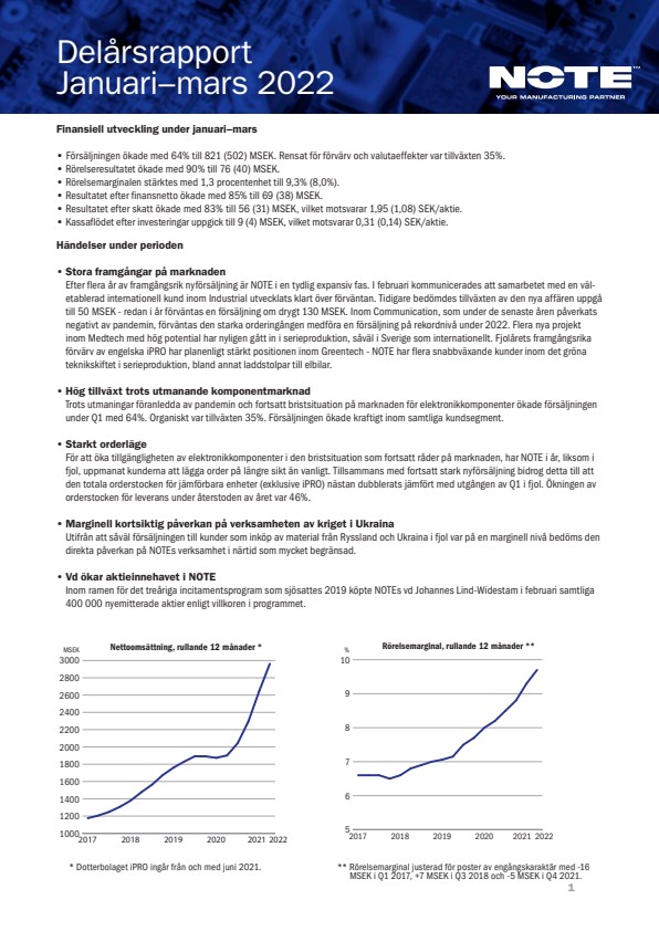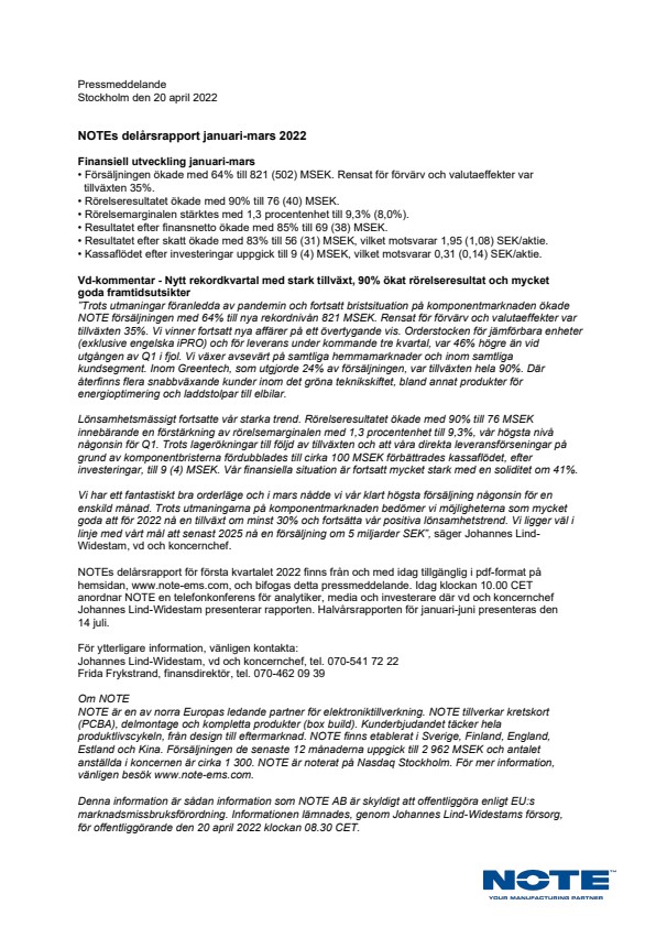 NOTEs delårsrapport för första kvartalet 2022 finns från och med idag tillgänglig i pdf-format på hemsidan, www.note-ems.com, och bifogas detta pressmeddelande. Idag klockan 10.00 CET anordnar NOTE en telefonkonferens för analytiker, media och investerare där vd och koncernchef Johannes Lind-Widestam presenterar rapporten. Halvårsrapporten för januari-juni presenteras den 14 juli.
