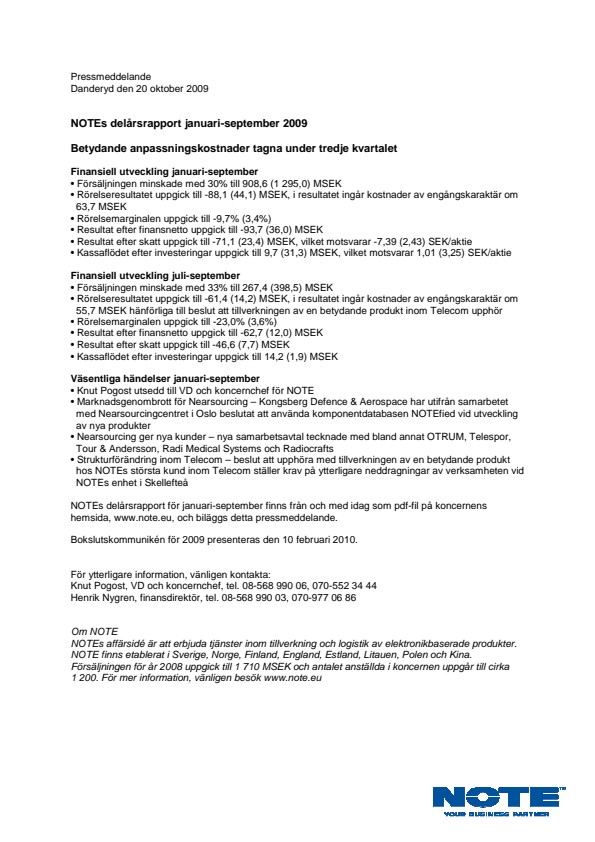 • Strukturförändring inom Telecom – beslut att upphöra med tillverkningen av en betydande produkt hos NOTEs största kund inom Telecom ställer krav på ytterligare neddragningar av verksamheten vid NOTEs enhet i Skellefteå