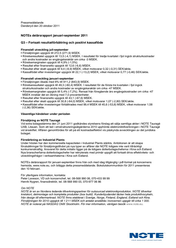 NOTEs delårsrapport för januari-september finns från och med idag tillgänglig i pdf-format på koncernens hemsida, www.note.eu, och biläggs detta pressmeddelande. Bokslutskommunikén för 2011 presenteras den 10 februari.