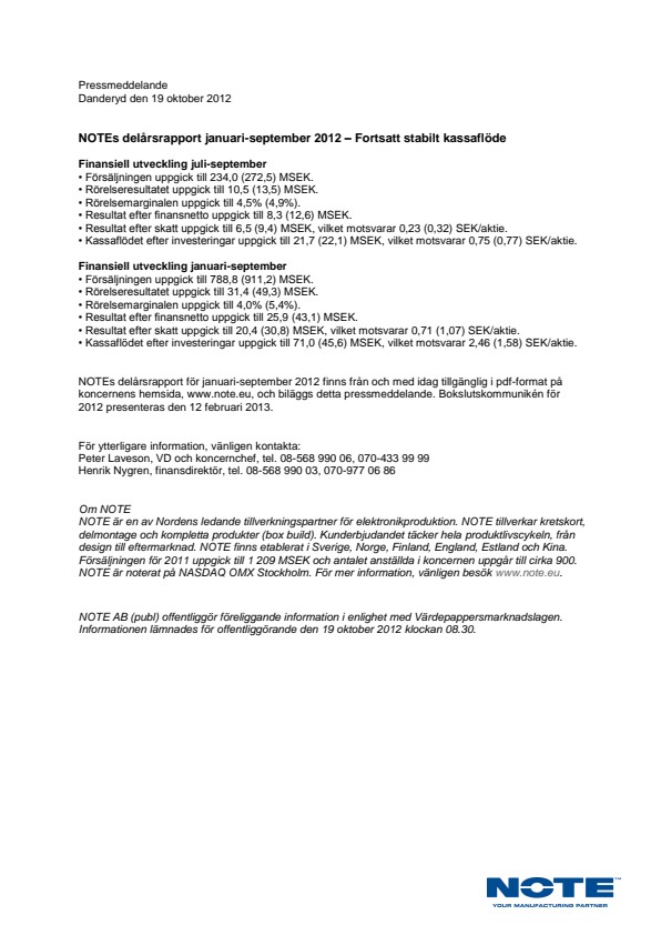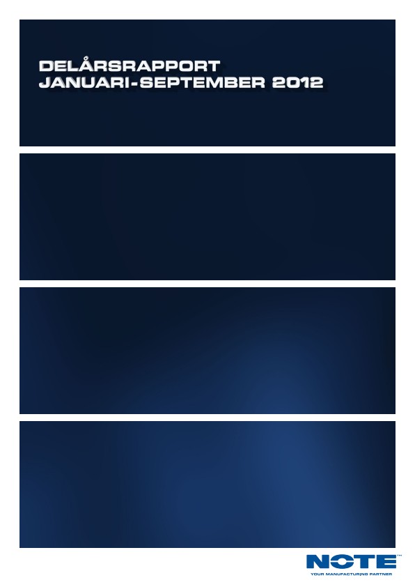 NOTEs delårsrapport för januari-september 2012 finns från och med idag tillgänglig i pdf-format på koncernens hemsida, www.note.eu, och biläggs detta pressmeddelande. Bokslutskommunikén för 2012 presenteras den 12 februari 2013.