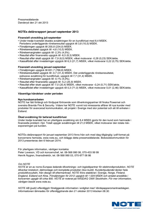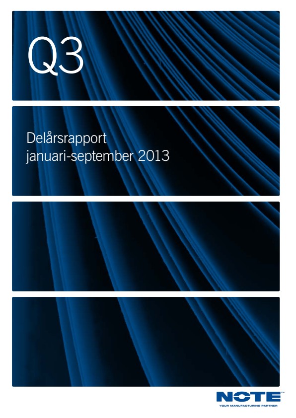 NOTEs delårsrapport för januari-september 2013 finns från och med idag tillgänglig i pdf-format på koncernens hemsida, www.note.eu, och biläggs detta pressmeddelande. Bokslutskommunikén för 2013 presenteras den 6 februari 2014.