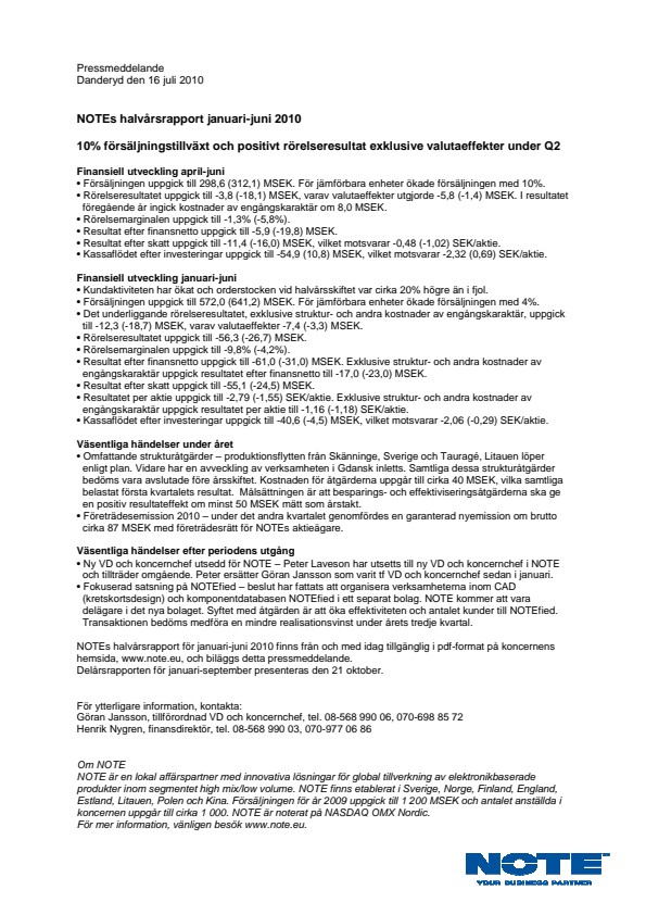 NOTEs halvårsrapport för januari-juni 2010 finns från och med idag tillgänglig i pdf-format på koncernens hemsida, www.note.eu, och biläggs detta pressmeddelande.