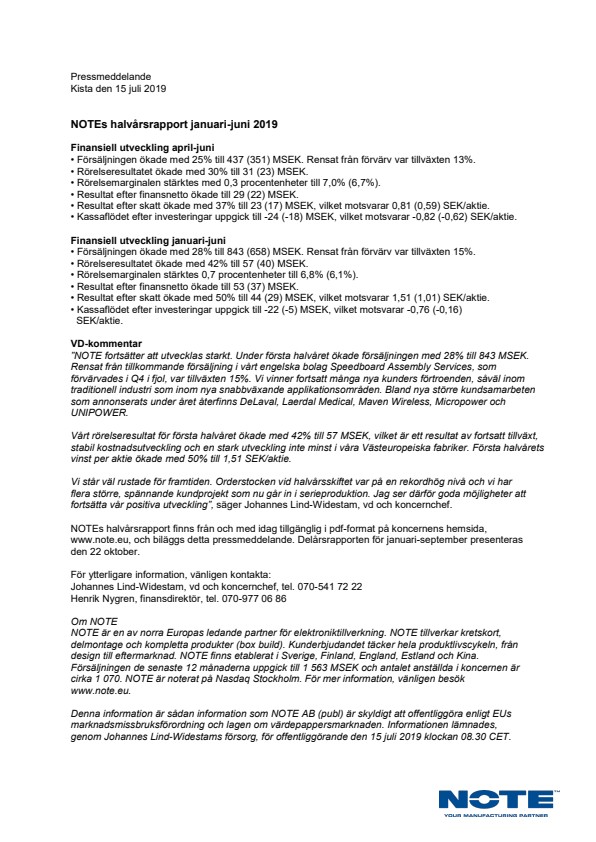 Denna information är sådan information som NOTE AB (publ) är skyldigt att offentliggöra enligt EUs marknadsmissbruksförordning och lagen om värdepappersmarknaden. Informationen lämnades, genom Johannes Lind-Widestams försorg, för offentliggörande den 15 juli 2019 klockan 08.30 CET.