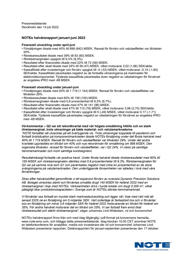 Denna information är sådan information som NOTE AB (publ) är skyldigt att offentliggöra enligt EUs marknadsmissbruksförordning och lagen om värdepappersmarknaden. Informationen lämnades, genom Johannes Lind-Widestams försorg, för offentliggörande den 14 juli 2022 klockan 08.30 CET.