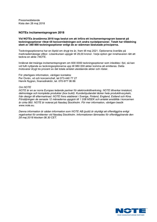 Denna information är sådan information som NOTE AB (publ) är skyldigt att offentliggöra enligt regelverket för emittenter vid Nasdaq Stockholm. Informationen lämnades för offentliggörande den 28 maj 2018 klockan 08.30 CET.