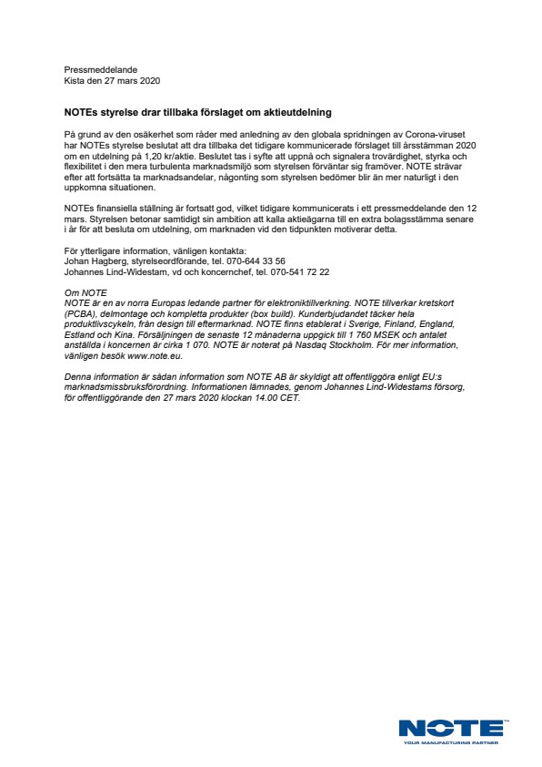 På grund av den osäkerhet som råder med anledning av den globala spridningen av Corona-viruset har NOTEs styrelse beslutat att dra tillbaka det tidigare kommunicerade förslaget till årsstämman 2020 om en utdelning på 1,20 kr/aktie. Beslutet tas i syfte att uppnå och signalera trovärdighet, styrka och flexibilitet i den mera turbulenta marknadsmiljö som styrelsen förväntar sig framöver. NOTE strävar efter att fortsätta ta marknadsandelar, någonting som styrelsen bedömer blir än mer naturligt i den uppkomna situationen.