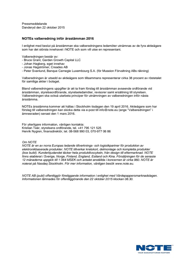 NOTEs årsstämma kommer att hållas i Stockholm tisdagen den 19 april 2016. Aktieägare som har förslag till valberedningen kan skicka detta via e-post till info@note.eu (ange ”Valberedningen” i ämnesraden) senast den 1 mars 2016.