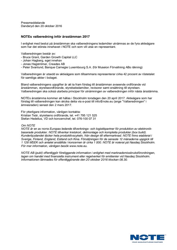 NOTEs årsstämma kommer att hållas i Stockholm torsdagen den 20 april 2017. Aktieägare som har förslag till valberedningen kan skicka detta via e-post till info@note.eu (ange "Valberedningen" i ämnesraden) senast den 2 mars 2017.