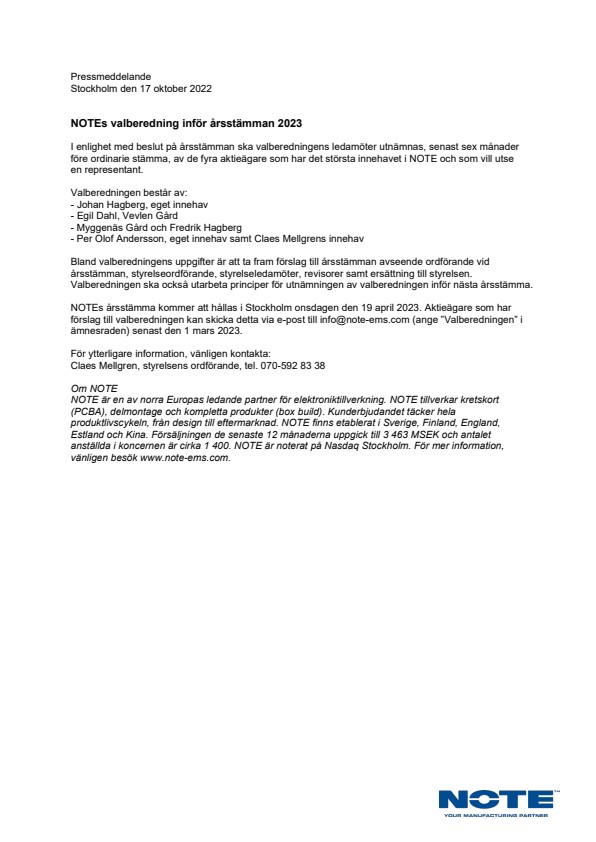 NOTEs årsstämma kommer att hållas i Stockholm onsdagen den 19 april 2023. Aktieägare som har förslag till valberedningen kan skicka detta via e-post till info@note-ems.com (ange ”Valberedningen” i ämnesraden) senast den 1 mars 2023.