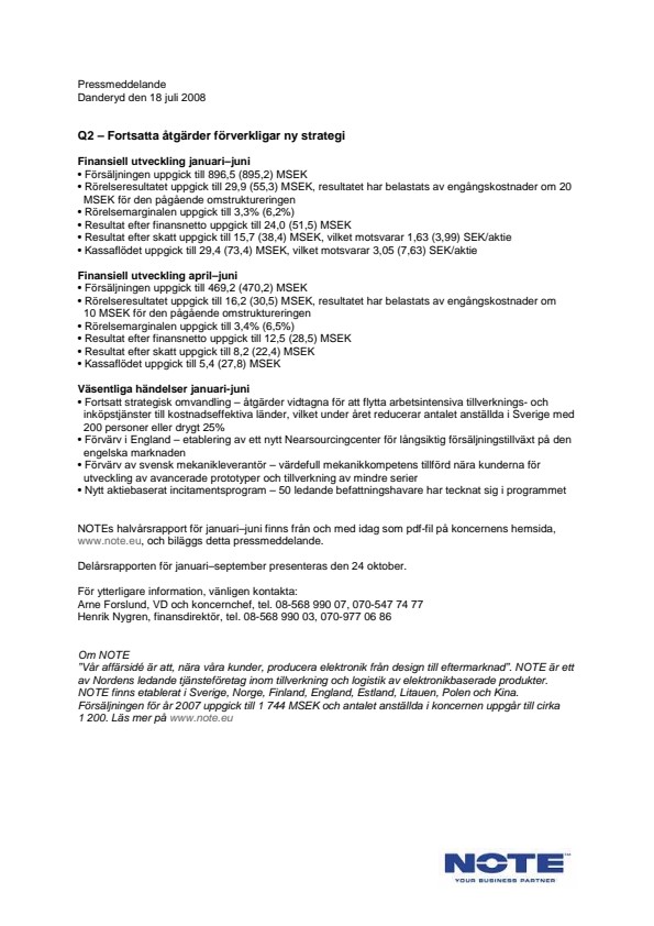 NOTEs halvårsrapport för januari–juni finns från och med idag som pdf-fil på koncernens hemsida, www.note.eu, och biläggs detta pressmeddelande.