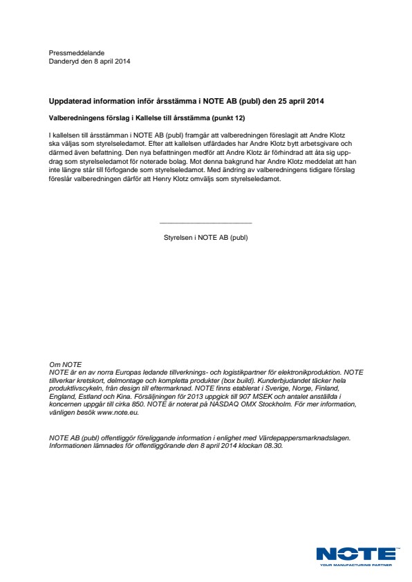 I kallelsen till årsstämman i NOTE AB (publ) framgår att valberedningen föreslagit att Andre Klotz ska väljas som styrelseledamot. Efter att kallelsen utfärdades har Andre Klotz bytt arbetsgivare och därmed även befattning. Den nya befattningen medför att Andre Klotz är förhindrad att åta sig upp-drag som styrelseledamot för noterade bolag. Mot denna bakgrund har Andre Klotz meddelat att han inte längre står till förfogande som styrelseledamot. Med ändring av valberedningens tidigare förslag föreslår valberedningen därför att Henry Klotz omväljs som styrelseledamot.