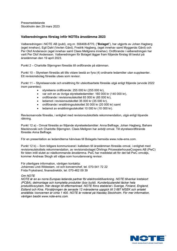 Valberedningen i NOTE AB (publ), org.nr. 556408-8770, (”Bolaget”), har utgjorts av Johan Hagberg (eget innehav), Egil Dahl (Vevlen Gård), Fredrik Hagberg, (eget innehav samt Myggenäs Gård) och Per Olof Andersson (eget innehav samt Claes Mellgrens innehav). Ordförande i valberedningen har varit Per Olof Andersson. Valberedningen för Bolaget lägger fram följande förslag till beslut på årsstämman den 19 april 2023.