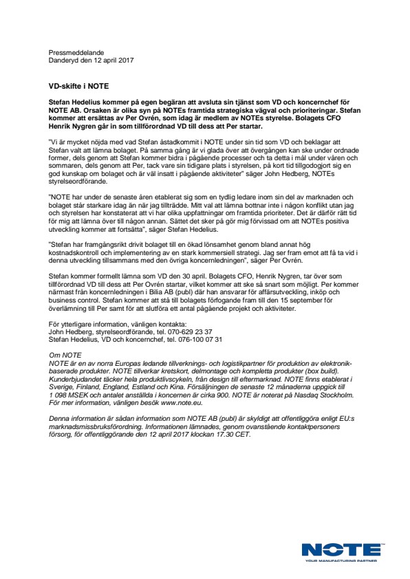 Stefan Hedelius kommer på egen begäran att avsluta sin tjänst som VD och koncernchef för NOTE AB. Orsaken är olika syn på NOTEs framtida strategiska vägval och prioriteringar. Stefan kommer att ersättas av Per Ovrén, som idag är medlem av NOTEs styrelse. Bolagets CFO Henrik Nygren går in som tillförordnad VD till dess att Per startar.